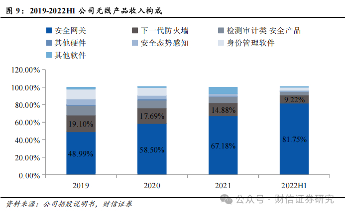 网络安全产品是指用于保护网络和网络资源免受攻击、破坏、泄露等安全威胁的软件、硬件和服务。这些产品和解决方案旨在保护数据的完整性、可用性和机密性,以及确保网络服务的连续性和可靠性。公司网络安全产品可分为硬件安全产品和软件安全产品。1)硬件安全产品:主要包括安全网关、SMB安全网关、下一代防火墙、检测审计类安全产品等,2021年收入为6.32亿元,占比为89.64%;2)软件安全产品:主要包括安全态势感知及身份管理产品等安全管理软件;2021年收入为0.73亿元,占比为10.36%。