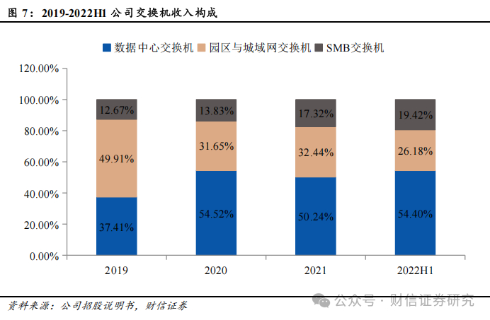 交换机是搭建网络的核心设备之一,主要功能为扩大网络覆盖范围,能为子网络提供更多的连接端口,以便连接更多的服务器、计算机、移动终端及物联网终端。交换机广泛应用在数据中心网络、园区网络等各类网络环境。公司交换机产品根据应用场景不同主要分为数据中心、园区与城域网及 SMB 三大交换机系列。1)数据中心交换机:交换机中的主要收入来源,主要部署在各种数据中心场景,2021年收入为23.82亿元,占比达到50.24%;2)园区与城域网交换机:主要用于大学校园网及企业内部网,2021年收入为15.38亿元,占比达到32.44%;3)SMB交换机:主要负责承载中小企业的数据网、监控网、无线网的接入回传,并直接连接中小企业的电脑、监控摄像头、无线 AP 以及各种 IP 终端,2021年收入为8.21亿元,占比达到17.32%。