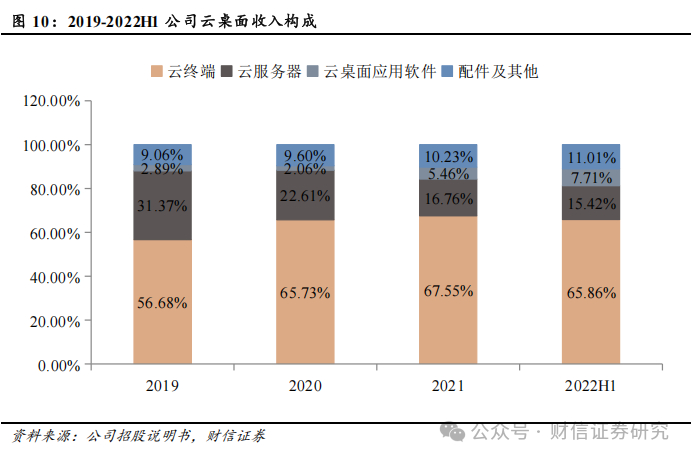 公司的云桌面解决方案是由云服务器、云终端、云桌面软件及相关配件构成,针对课堂、办公、研发、移动、分支、窗口、产线等多种应用场景下的需求形成不同侧重而又整体融合的差异化解决方案。1)云服务器:包含了服务器硬件和出厂已内置的云平台软件和云桌面管理控制器软件;2)云终端:包含了盒子形态和一体机形态的硬件和出厂已内置的云终端系统软件和客户端软件;3)云桌面应用软件:包括用于教学管理和云盘两类应用软件,以软件和授权的方式配套提供;4)配件及其它:主要包括显示器、键盘及鼠标等。