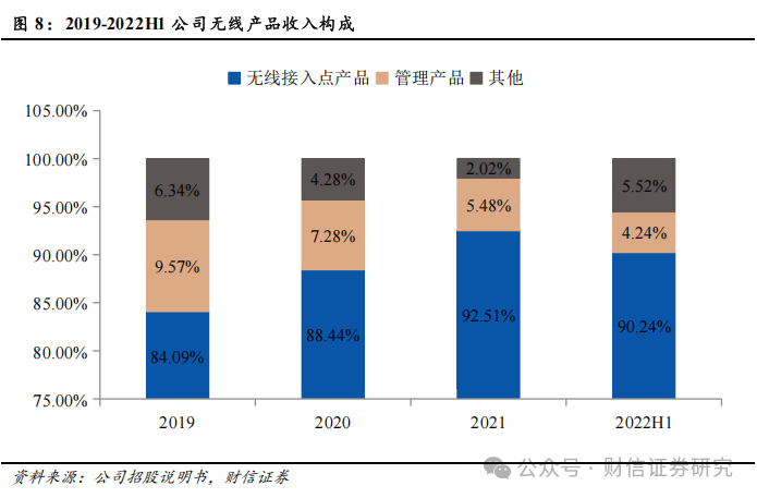 无线产品是无线局域网的核心部件,主要用途为将计算机、移动终端以及物联网等终端设备,以无线连接的方式接入到该局域网。无线产品还可通过对有线局域网提供长距离的无线连接,或通过长距离无线来连接多个有线局域网,达到延伸网络范围的目的。公司无线产品主要包括无线接入点产品与相关管理产品等。1)无线接入点产品:是无线产品的主要收入来源,主要包括场景化部署无线接入点、放装型无线接入点及 SMB 无线接入点,2021年收入为15.80亿元,占比为92.51%。2)管理产品:主要包括无线控制器、无线管理与应用系统(WIS)等,2021年收入为0.94亿元,占比为5.48%。