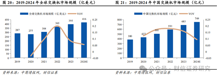 在数字化转型和人工智能趋势的推动下,随着交换机在数据中心网络、园区网络、工业互联网等各类网络环境中的应用,全球及中国交换机市场规模稳步增长。根据中商产业研究院预计,到2024年,全球交换机市场规模将达到416亿美元,同比增长约5%;中国交换机市场规模将增至749亿元,同比增长约9%。