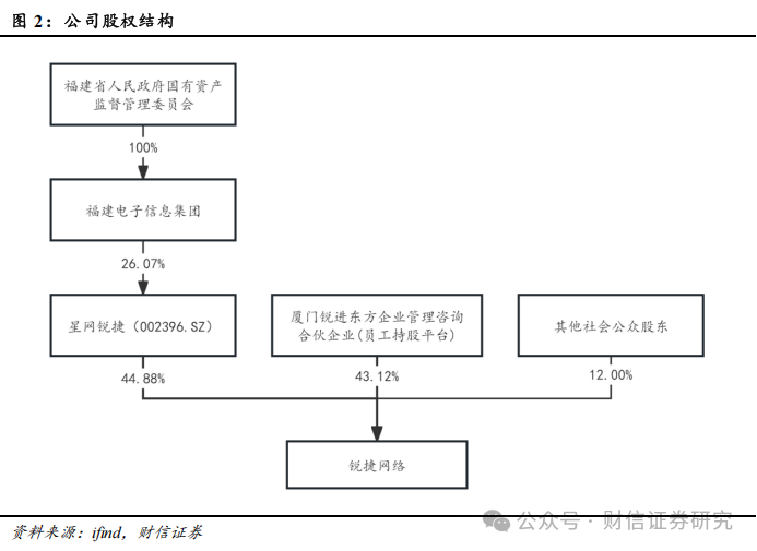 福建省国资委为公司实际控制人,员工持股比例高。福建省国资委通过星网锐捷(002396)间接持股44.88%,厦门锐进东方企业管理咨询合伙企业(员工持股平台)持股43.12%,其他社会公众持股12.00%。