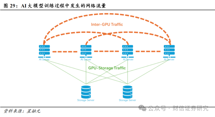 AI大模型训练需要哪些网络流量:1)第一类是GPU之间互相同步梯度和中间激活的网络流量,它发生在所有GPU之间,是一种广播式流量,逻辑上需要所有GPU全连接。2)第二类是GPU和存储服务器之间的流量,它仅仅发生在GPU和存储服务器之间,是一种单播流量,逻辑上仅需要以存储服务器为中心的星型连接。