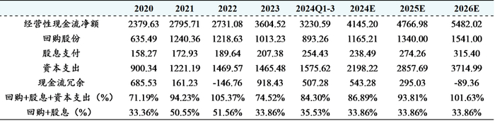 表4:2020-2026E北美四大云厂商经营性现金流、回购股份、股息支付和资本支出(分年度,单位:亿元)