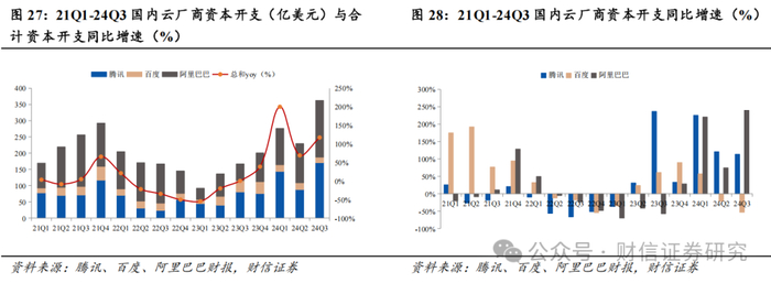 国内也在加速落地AI算力及配套网络产品采购。电信运营商方面,2024年10月21日,中国电信官网公布中国电信服务器(2024-2025年)集采项目中标结果,包括GPU服务器(A系列和G系列)共计13135台,总金额40亿元左右。5月16日,中国移动公布了2024年至2025年新型智算中心集采项目中标结果,标包一包含7994台人工智能服务器及配套产品,标包二60台白盒交换机,标包一共计金额191亿元左右,标包二采购失败,将重新招标。4月25日,中国联通官网公布了2024年人工智能服务器公开集采中标结果,包括2503台人工智能服务器和688台关键组网设备RoCE交换机,总金额20亿元左右。互联网企业方面,2024年第三季度百度、阿里巴巴和腾讯三家资本开支合计达到362.30亿元,创下历史新高,同比增速达到117.15%,大部分是投向云基础设施,尤其是AI的基础设施上。