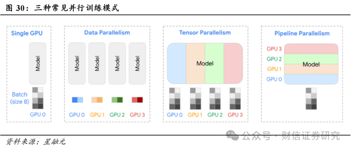 其中,第一类GPU之间的网络流量与传统数据中心内部流量大不相同,这是由于AI大模型训练需要并行训练。当前广泛使用的并行训练模式主要有三类:1)数据并行:将不同的样本数据分配给不同的GPU,以加快训练速度,用在主机之间;2)张量并行:将模型的参数矩阵划分为子矩阵,并分配到不同的GPU上,以解决内存限制并加速计算,一般用在主机内部;3)流水线并行:将模型分为多个阶段,每个阶段分配给不同的GPU,以改善内存利用率和资源效率,一般用在主机之间。
