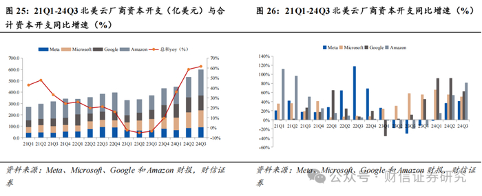 北美云厂商Capex季度增速创下新高,后续算力投入仍有保障。北美四大云厂商发布2024年Q3财报,Meta、Microsoft、Google、Amazon四家云厂商的2024年Q3合计资本开支达到598亿元,同比增长61.66%,季度增速达到近四年新高,环比Q2增速的58.63%仍在继续提升,且各云厂商对于Q4以及2025年的资本开支情况仍维持乐观指引。AI算力景气度持续得到验证,虽然近期有投资者担心算力投入和现金流成长的匹配度问题,但是1)在此阶段算力投资的军备竞赛仍是第一要务,根据Google的CEO所言,公司认为在现阶段对于AI基础设施投资不足的风险远远大于投资过剩的风险。2)当下AI业务暂未产生较多正现金流的情况下,各云厂商的现金流也足以覆盖未来1-2年的算力投资高增速。24Q1-3四大云厂商合计经营性现金流净额3231亿元,回购股份893亿元,股息支付254亿元,资本支出1576亿元,三者合计占用经营性现金流净额的84%,现金流仍有余量。考虑未来几年资本开支的可持续性:1)假设2024年四大云厂商经营性现金流净额同比2023年增长15%(2020-2023年复合增速15%左右),达到4145亿元;回购和股息支付比例不变,而资本开支维持50%的增速达到2198亿元,2024年全年仍将维持500亿元左右的现金流冗余。2)假设2025/2026年四大云厂商的经营性现金流净额继续维持15%同比增速,且回购股份和股息支付比例不变,而资本开支维持30%的增速,预计2025年的现金流冗余为295亿元;2026年的现金流冗余为-89亿元,回购+股息支付+资本支出与经营性现金流净额基本持平。根据以上测算,从保障一定现金流冗余以及股份回购+股息支付的稳定性的角度出发,北美四大云厂商在2024-2025年还有足够的能力和意愿维持算力投资的高增速,在当期我们仍然看好高强度算力投资给AI算力产业链带来的业绩增长。后续在2026年或之后的某个阶段,各云厂商的经营策略、包括市场的考察重心或将转向AI带来的收入空间和投资强度的匹配。