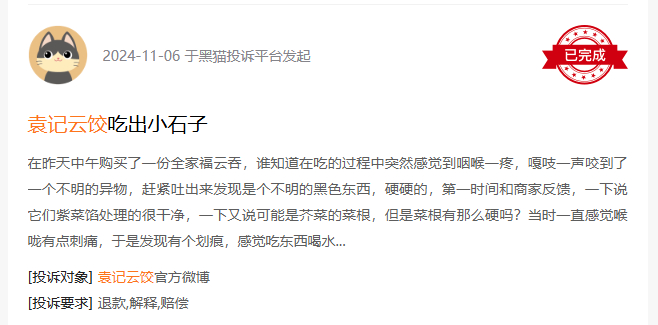 记者在黑猫投诉平台上注意到,与袁记云饺相关的投诉超过600条,在投诉理由中“吃出异物”并不少见。有多位网友称,在袁记云饺中吃出过石子小塑料片、蟑螂、蜗牛等。