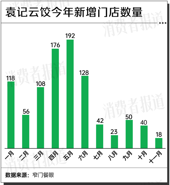 数据显示,截至11月,袁记云饺新增门店数量为954,其中781家门店均是在今年上半年新开,从今年7月开始,新店扩张速度明显降低,四个月时间里仅开了173家门店。