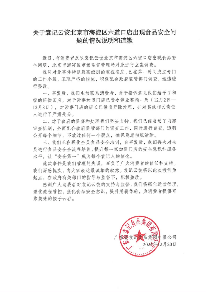 12月20日,袁记云饺官微发布《关于袁记云饺北京市海淀区六道口店出现食品安全问题的情况说明和道歉》。文中称,事发后,公司主动联系消费者,对于投诉意见公司给予了积极的赔偿回应,对于涉事加盟门店已责令停业整顿一周(12月2日-12月8日),对涉事门店的店长已做出开除处理,并对其他相关责任人进行了严肃处分。