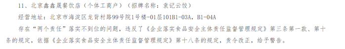 三家涉事门店中,北京星冉餐饮有限公司、北京鑫鑫晟餐饮店(个体工商户)因存在“两个责任”落实不到位的问题,违反了《企业落实食品安全主体责任监督管理规定》第三条第一款、第十条的规定,依据《企业落实食品安全主体责任监督管理规定》第十八条的规定,责令改正,给予警告。