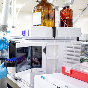 产业园内,研究员使用液相色谱仪,准备对中药材的含量等指标开展分析。受访者供图