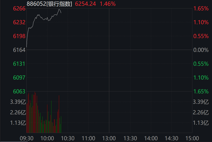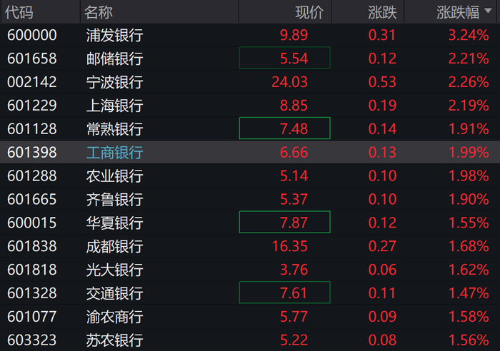 中国银行、农业银行、建设银行均接近历史新高,江苏银行创阶段新高,浦发银行涨超3%。