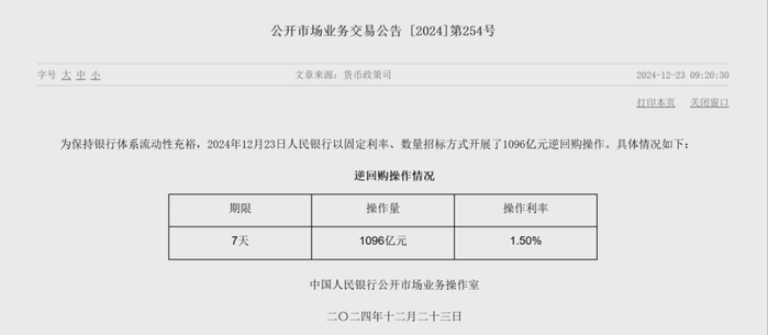 央行公告称,为保持银行体系流动性充裕,12月23日以固定利率、数量招标方式开展1096亿元7天期逆回购操作,操作利率1.50%。