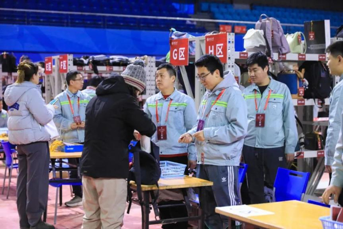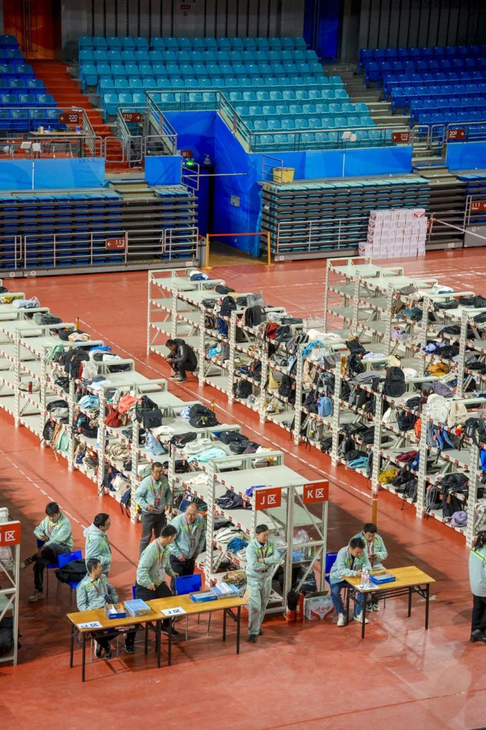 工作人员协助考生存放物品、发放号码牌