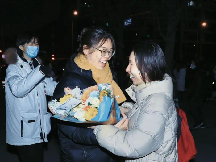 考生们走出校门,迎接鲜花与拥抱