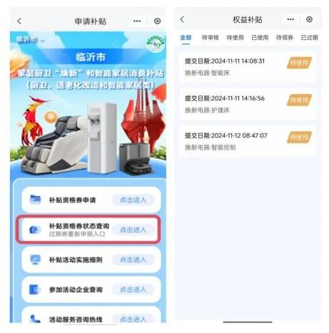 用户点击进入“补贴券状态查询”界面,可以查看已领取的补贴券及其状态。
