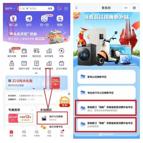 用户打开云闪付APP,并确认首页左上角的位置为“临沂市”。然后在“本地精彩”中找到“临沂以旧换新专区”,点击进入“鲁换新”小程序。在打开家装厨卫“焕新”和智能家居服务平台页面,选择“直接购新享补贴”。