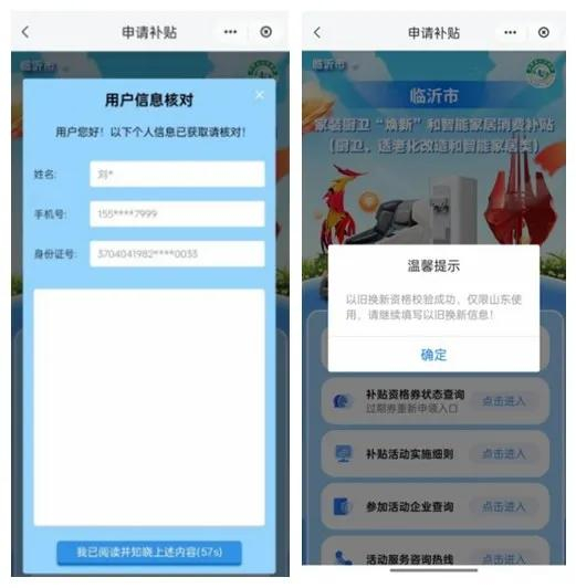 用户点击进入家装厨卫“焕新”和智能家居补贴专区界面,系统弹窗提示授权申请,用户同意云闪付APP授权“鲁换新”小程序获取注册手机号、姓名、证件号信息,进入“用户信息核对”界面,信息核对无误后,点击“我已阅读并知晓上述内容”