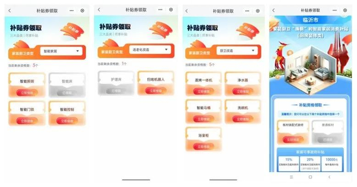 根据需求选择换智能家居、厨卫改造、适老化、旧房装修对应类型,然后点击领券。页面弹窗提示,点击确定。领券成功,界面显示以旧换新资格码。