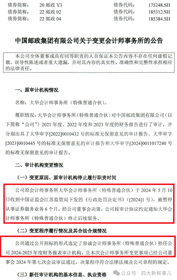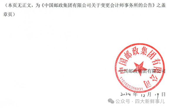 中国邮政集团有限公司于2024年12月19日发布了《关于变更会计师事务所的公告》(公告全文见下文截图)。公告显示,该公司原会计师事务所大华会计师事务所(特殊普通合伙)于2024年5月10日收到中国证监会江苏监管局下发的《行政处罚决定书》([2024]1号),被暂停从事证券服务业务6个月,经公司董事会决策,该公司按审计协议约定通知大华会计师事务所(特殊普通合伙)终止后续服务。