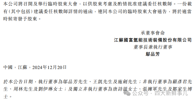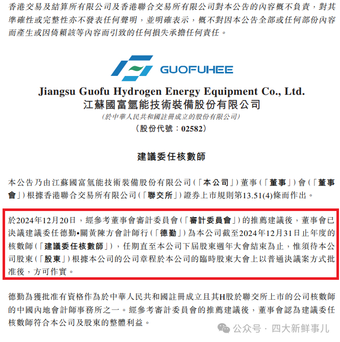 港股上市公司国富氢能(02582.HK)于2024年12月20日发布了《建议委任核数师》公告。公告显示,于2024年12月20日,经参考董事会审计委员会的推荐建议后,董事会已决议建议委任德勤•关黄陈方会计师行为该公司截至2024年12月31日止年度的核数师,任期直至该公司下届股东周年大会结束为止,惟须待该公司股东根据该公司的公司章程于该公司的临时股东大会上以普通决议案方式批准后,方可作实。