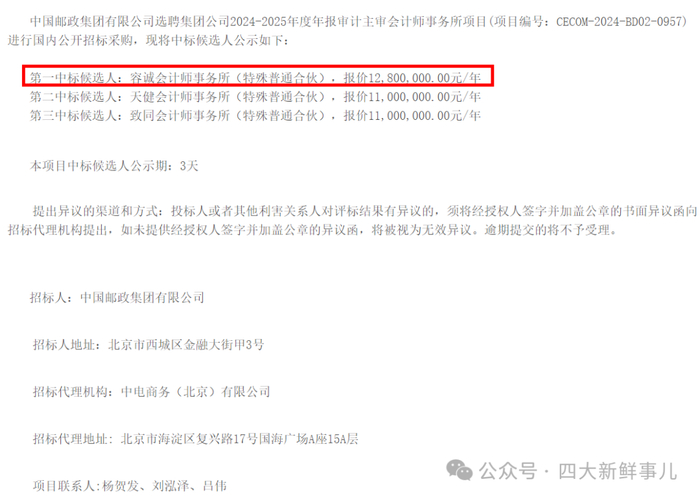2024年10月30日,中国邮政集团官网发布《【中国邮政集团有限公司选聘集团公司2024-2025年度年报审计主审会计师事务所项目】中标候选人公示》。公示显示,该项目第一中标候选人为容诚会计师事务所(特殊普通合伙),报价12,800,000.00元/年。