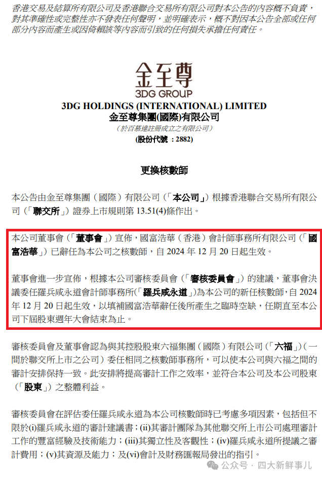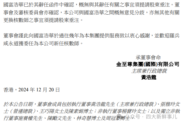 港股上市公司金至尊集团(02882.HK)于2024年12月20日发布了《更换核数师》公告。公告显示,该公司董事会宣布,国富浩华(香港)会计师事务所有限公司已辞任为该公司之核数师,自2024年12月20日起生效。