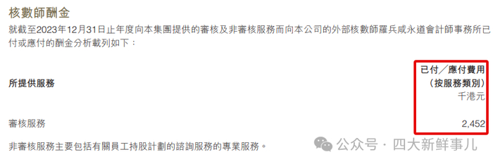 根据该公司2023年年度报告披露,该公司2023年度支付罗兵咸永道2,452,000港元(折合人民币约230万元)的审计费用。
