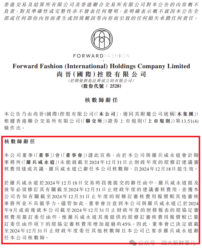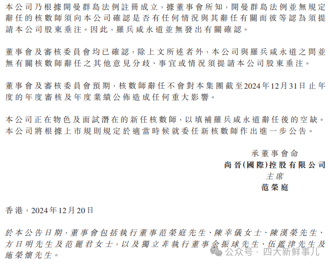 港股上市公司尚晋国际控股(02528.HK)于2024年12月20日发布了《核数师辞任》公告。公告显示,该公司董事会谨此宣布,由于该公司与罗兵咸永道会计师事务所未能就截至2024年12月31日止财政年度的经修订建议审核费用达成共识,罗兵咸永道已辞任该公司核数师,自2024年12月18日起生效。