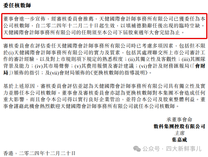 董事会进一步宣布,经审核委员会推荐,天健国际会计师事务所有限公司已获委任为该公司核数师,自二零二四年十二月二十日起生效,以填补德勤辞任后出现的临时空缺。天健国际会计师事务所有限公司的任期须至该公司下届股东周年大会完结为止。