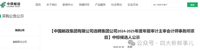 中国邮政集团曾于2024年9月30日发布《【选聘集团公司2024-2025年度年报审计主审会计师事务所项目】招标公告》,详见《速看!中国邮政集团选聘2024-2025年度年报审计主审会计师事务所》。