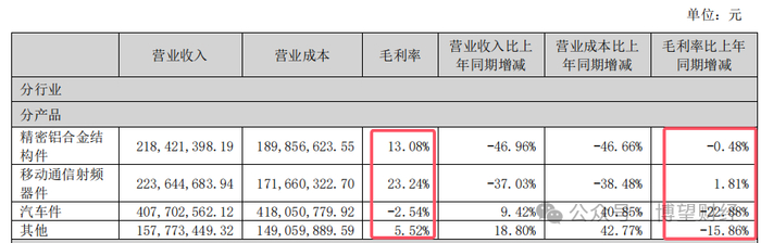 尽管精密铝合金结构件和移动通信射频器件的毛利率虽然未出现明显变动,但营收同比分别下降了46.96%和37.03%。