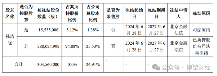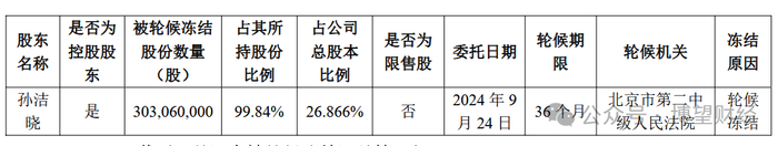 2024年10月,孙洁晓所持的约3.03亿股股份又遭到了轮候冻结,占其所持股份的99.85%,占公司总股本的26.87%。出现该情况的原因是,泛海投资、民信资本以及新天鼎地合伙企业等因合同纠纷、股权转让争议等问题将其起诉。