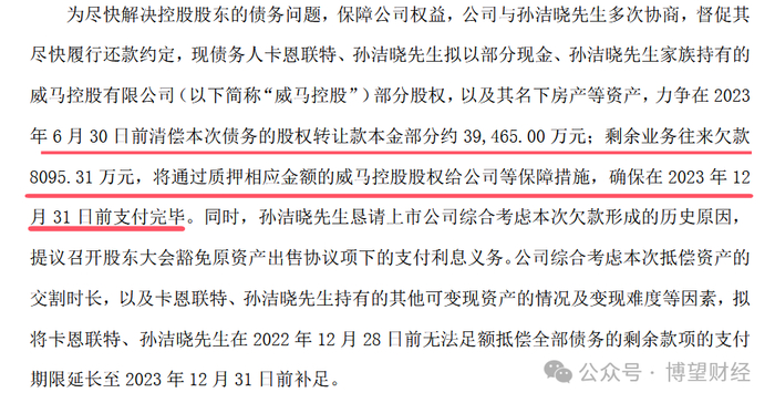 期间,孙洁晓曾尝试用股权抵债。根据2022年12月公告,卡恩联特、孙洁晓拟以部分现金、孙洁晓家族持有的威马汽车部分股权,以及其名下房产等资产作为清偿股权转让款本金部分约3.95亿元部分保证。剩余部分通过过质押相应金额的威马控股股权确保还清。