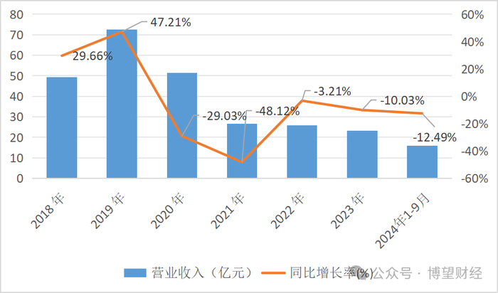 在2019年,春兴精工营业收入规模达到了高点72.62亿元,当年净利润尚有2213.37万元。然而,此后公司的营业收入开始呈现出连年下滑的趋势。2020年至2023年间,春兴精工营业收入分别为51.53亿元、26.73亿元、25.88亿元和23.28亿元,同比分别减少29.03%、48.12%、3.21%和10.03%。可见,公司经营确实出现了问题。