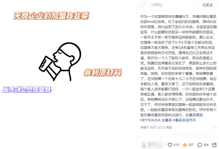 前几天,有个自称是“喜茶海外加盟商”的博主发小红书吐槽“自己被割了韭菜”,同时号召全美国的加盟商