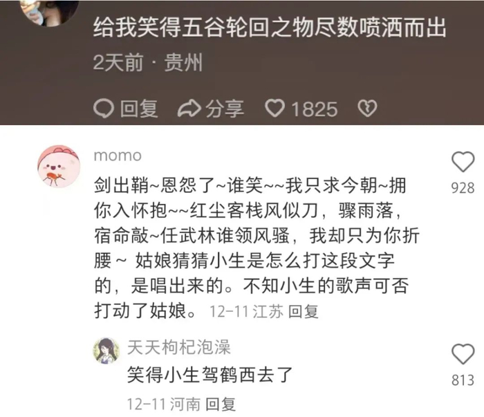 大家不再留言“笑死”,而是替换成“笑得小女子/小生一命呜呼”;