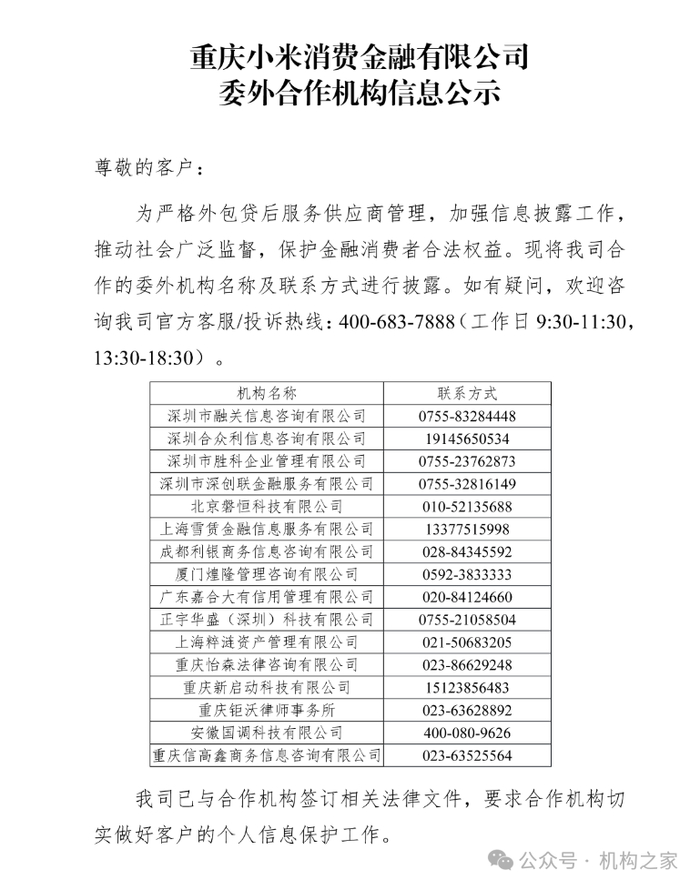 图小米消费金融委外合作机构信息公示。