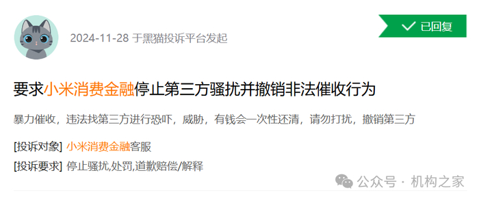 另一名用户则投诉称,小米消费金融采取暴力催收手段,违法委托第三方进行恐吓和威胁,并且在表达有钱愿意一次性还清欠款后,仍遭遇不当行为。该用户要求撤销第三方暴力催收,维护其正当权益。