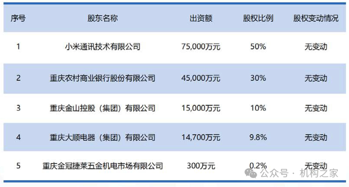 小米消费金融成立于2020年5月29日,注册资本15亿元人民币,主营个人贷款业务。股东结构上,小米通讯以7.5亿元出资占股50%,为控股股东;渝农商行出资4.5亿元,占股30%;金控集团、大顺电器及金冠捷莱分别持股10%、9.8%和0.2%。目前,股权结构稳定,各股东持股比例未发生变化。