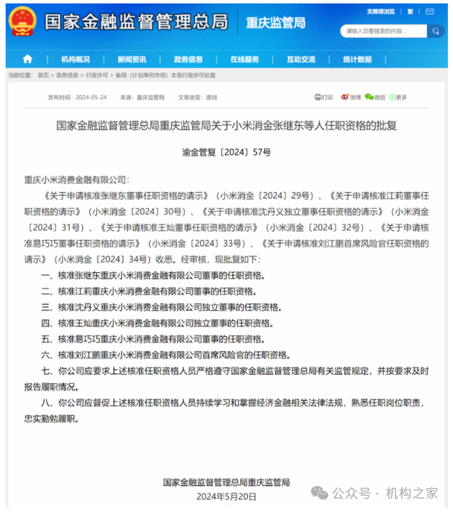 图小米消费金融张继东等人任职资格的批复。