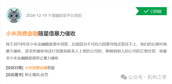 一位用户反映,2019年通过小米消费金融随星借贷款,因不可抗力因素未能按时还款,随后遭遇长期暴力催收,催收电话甚至打到了紧急联系人所在公司,严重影响了他人正常经营。该用户要求小米消费金融随星借停止暴力催收,保护消费者的合法权益。