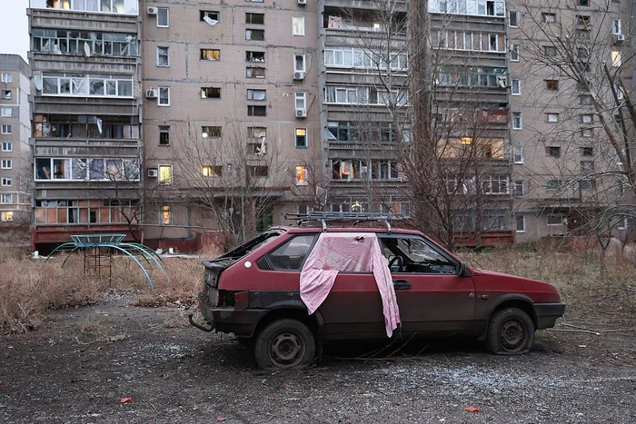 当地时间2024年12月3日,顿涅茨克地区戈尔洛夫卡,受到乌克兰军事打击受损的公寓楼和汽车。视觉中国 图