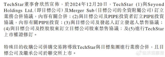 2024年12月20日,TechStar Acquisition Corporation(TechStar)宣布与Seyond Holdings Ltd.(图达通)及其全资子公司Merger Sub签订业务合并协议,达成特殊目的收购公司并购交易(SPAC并购交易)。此项交易将助力图达通通过TechStar在香港联交所上市。TechStar与三名PIPE投资者签订了协议,这些投资者包括黄山建投资本、富策及珠海横琴华盖。PIPE投资总额约为551.3亿港元。