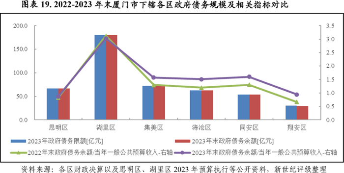 以2023年末各区政府债务余额与当年一般公共预算收入相对比,2023年末思明区和翔安区政府债务余额仍均能够被其当年一般公共预算收入覆盖,均为0.9倍,湖里区该比值在各区中仍最高,为3.0倍;集美区、海沧区和同安区分别为1.6倍、1.5倍和1.6倍。