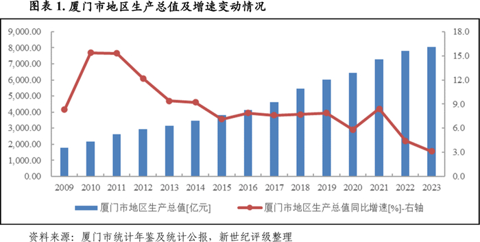 厦门市是我国最早实行对外开放政策的四个经济特区、五个计划单列市之一,是“中国(福建)自由贸易试验区”三片区之一,也是中央支持发展的国际航运中心、国家科技金融结合试点城市、两岸新兴产业和现代服务业合作示范区、两岸区域性金融服务中心,区位及政策支持优势显著。受限于较小的人口规模及区划面积,2023年厦门市经济总量在福建省排名仍位列第三位,在五个计划单列市中仍居末位;主要受固定资产投资增长乏力等影响,当年经济增速较上年有所回落,低于福建省及全国水平。全年全市实现地区生产总值8066.49亿元,同比增长3.1%,分别低于福建省、全国水平1.4个百分点和2.1个百分点;人均地区生产总值为15.14万元,为全国人均生产总值的1.69倍。从产业发展看,2023年受电子行业去库存影响,全市工业生产承压,但服务业保持较快增长,对经济发挥支撑作用。主要受基础设施投资持续收缩影响,2023年厦门市固定资产投资同比增长0.5%,增幅较上年收窄9.7个百分点;消费和进出口保持增长,但受国内外经济环境等因素影响,增速仍较低。2024年前三季度,厦门市经济运行总体保持稳定,当期实现地区生产总值6031.66亿元,同比增长4.9%,增速较上年同期上升2.9个百分点,低于福建省0.6个百分点、高于全国0.1个百分点。同期,全社会消费品零售总额同比增长2.0%,较上年同期持平;固定资产投资受房地产开发投资影响同比下降12.1%,降幅较上年同期扩大10.0个百分点;受进口下滑等因素影响,进出口总额增速转负,同比下降2.7%。