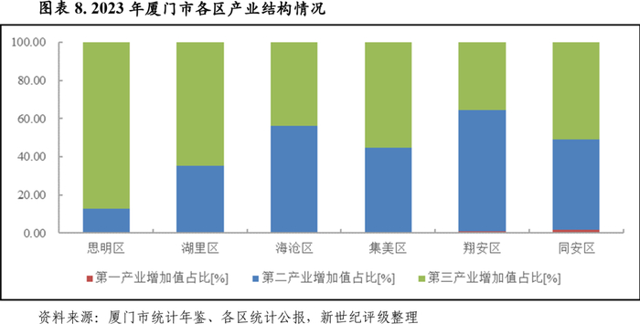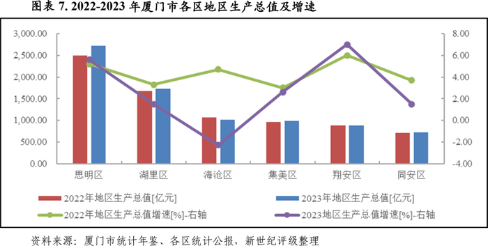 厦门市下辖各区经济发展存在一定差异,2023年除海沧区受经济外向度高、外部需求萎缩等因素影响,经济增速为-2.3%外,其余各区经济均保持增长。其中,岛内思明和湖里两区作为传统核心城区,服务业较发达,经济体量居前,2023年地区生产总值分别为2729.53亿元和1724.18亿元,同比分别增长5.6%和1.5%,合计占全市经济总量的55.2%,对全市经济贡献度较大;岛外海沧、集美、翔安和同安四区经济体量相对较小,除海沧区外,地区生产总值均未超过千亿,此外,翔安区经济增速为7.0%,位列各区首位,保持较好的赶超发展趋势。2024年前三季度,各区经济规模序列保持稳定,且均保持增长,但增速有所差异,其中,翔安区经济增速仍维持在较高水平,湖里区经济增速仍相对较低。