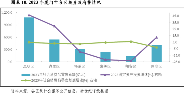 固定资产投资方面,厦门市各区固定资产投资增速差异较大。2023年思明区、湖里区及同安区固定资产投资增速分别为46.3%、29.4%和12.3%,其中思明区因房地产投资大幅增长,当期固定资产投资增速最高;其余三区固定资产投资呈不同程度的下降,其中,翔安区受建安投资大幅下降影响,固定资产投资下降幅度高达23.2%,集美区同时受基础设施及房地产投资下降影响,固定资产投资同比下降21.6%。