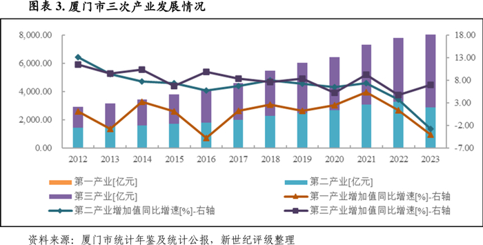 凭借区位优势及政策优势,厦门市对外经济发展较早,为机械和电子产业发展奠基了良好的基础,同时依托科教、文化及港口资源,厦门市先进制造业、现代服务业发展较快,旅游业对经济拉动力不断增强。2023年,厦门市实现地区生产总值8066.49亿元,受限于较小的人口规模及区划面积,经济总量在福建省排名仍位列第三位,在五个计划单列市中仍居末位;同比增长3.1%,主要受固定资产投资增长乏力等影响,较上年下降1.3个百分点,分别低于福建省、全国水平1.4个百分点和2.1个百分点;按常住人口计算,全市人均生产总值达15.14万元,较上年增加0.40万元,为福建省人均生产总值的1.17倍、全国人均生产总值的1.69倍,在五个计划单列市中高于大连市,居于第四位。从产业结构方面看,2023年厦门市工业生产承压,服务业保持稳步增长,全市第一、第二、第三产业增加值分别为27.73亿元、2867.94亿元和5170.81亿元,同比增速分别为-4.0%、-2.8%和7.0%;三次产业结构由上年的0.4:41.4:58.2调整为0.3:35.6:64.1。2024年前三季度,厦门市经济运行总体保持稳定,当期实现地区生产总值6031.66亿元,同比增长4.9%,较上年同期上升2.9个百分点,低于福建省0.6个百分点、高于全国0.1个百分点。其中,第一、第二、第三产业增加值分别为16.36亿元、2073.07亿元和3942.23亿元,同比增速分别为-10.3%、6.3%和4.0%。
